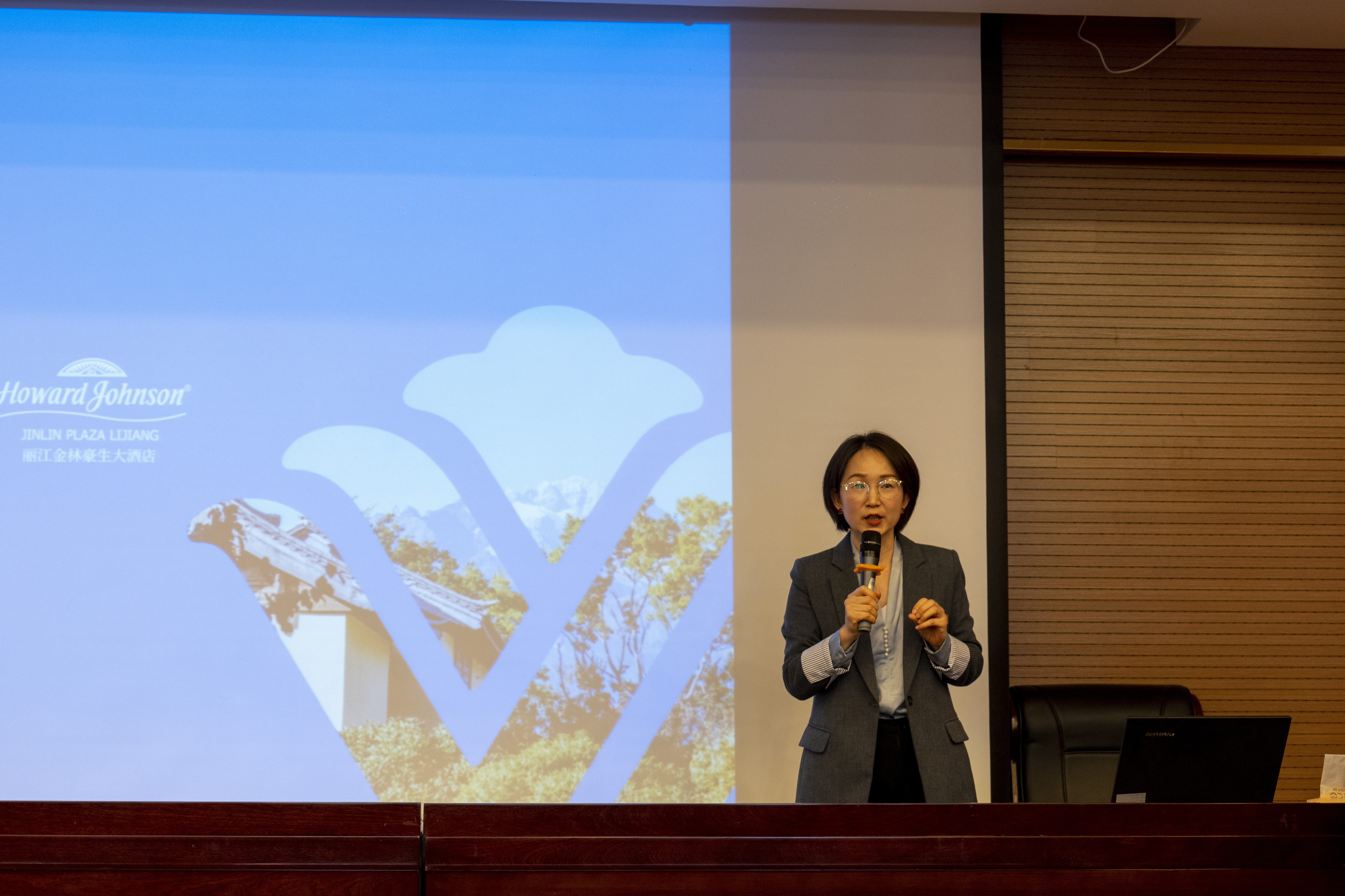 第二阶段由丽江金林温德姆至尊豪廷度假酒店和丽江金林豪生大酒店的人事经理朱慧进行企业宣讲。朱慧分别从酒店的基本情况、招聘岗位、工作待遇等方面进行了详细讲解,希望更多优秀的同学加入她们的实习团队。