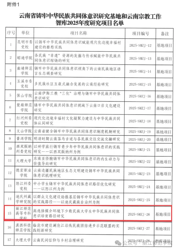 近日,在云南省民族宗教事务委员会印发的《省民族宗教委关于做好云南省铸牢中华民族共同体意识研究基地与云南宗教工作智库相关工作的通知》中,我院教师姚静申报的课题“高选择媒介环境下少数民族大学生中华民族共同体意识培育路径研究”获准立项。