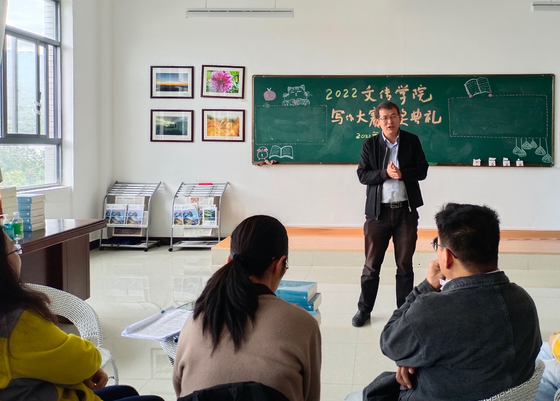 活动现场,韩敬源老师说,写作是文传学院学生的核心素养和必备职业能力。今天的活动很专业,没有“领导”,不说场面话,我们就是一群热爱热写作的人。蔡晓龄老师点评了部分获奖作品。她认为,写作是对某一感官瞬间的描写和记录,要贴着时代创作。针对一等奖作品《小芳》,她建议结尾还可以修改得更有回味。李勋阳老师在黑板上写了两句诗送给大家:“少无适俗韵,清水出芙蓉。”李老师说,写作的关键是“真善美”;好作品要有丰富的细节,并通过细节营造画面感;好作品不只是“书写真实”,还须“仿佛若有光”。马金艳老师说,不写错别字、好好写字,是文传学生的必备专业素养,希望大家注意。