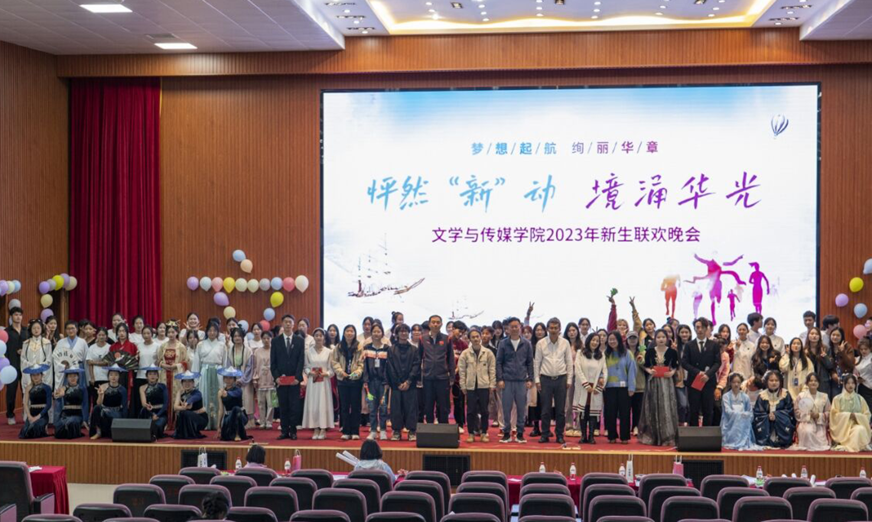 2023年10月22日晚19点,文学与传媒学院在学校报告厅隆重举行了以“怦然心动,境涌华光”为主题的迎新晚会。学院院长韩敬源、副书记刘治中、副院长符二喜、专职组织员普孝辉及师生500多人出席晚会。
