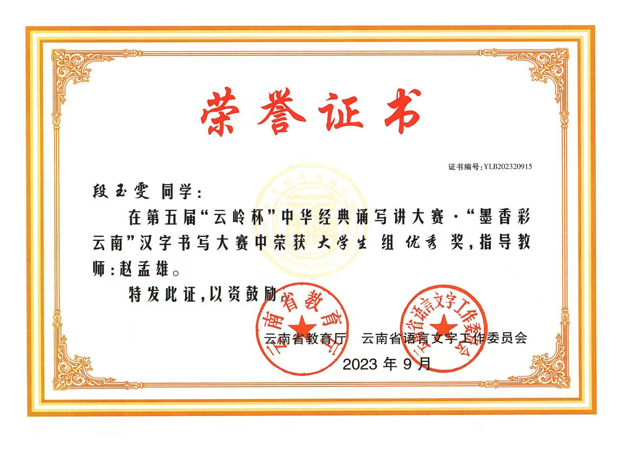 “墨香彩云南”汉字书写赛项中,崔丹同学的作品《小窗幽记选抄》获大学生组二等奖;蒋赛莲同学的作品《沁园春·雪》获大学生组三等奖;段玉雯同学的作品《兰亭序》获大学生组优秀奖。王舒寅老师的作品《西南联大纪念碑碑文(节选)》、赵孟雄老师的作品《石鼓文》获教师组优秀奖。