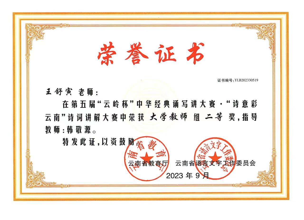 “诗意彩云南”诗词讲解赛项中,王舒寅老师的《诗经·关雎》获大学教师组二等奖,娄丹丹老师的作品《古诗十九首·行行重行行》获大学教师组优秀奖。田文芝同学的作品《渔家傲》、岳蕊同学的《江城子·乙卯正月二十日夜记梦》获大学生组优秀奖。学院院长韩敬源、副书记刘治中分别担任指导教师,对参赛选手进行指导并喜获优秀指导教师奖。