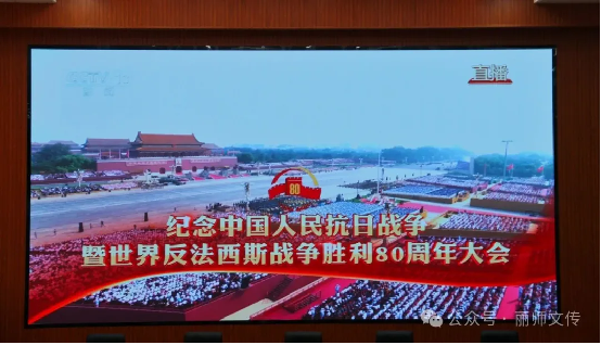 学生们的目光都聚集向了大屏幕上的阅兵仪式。
