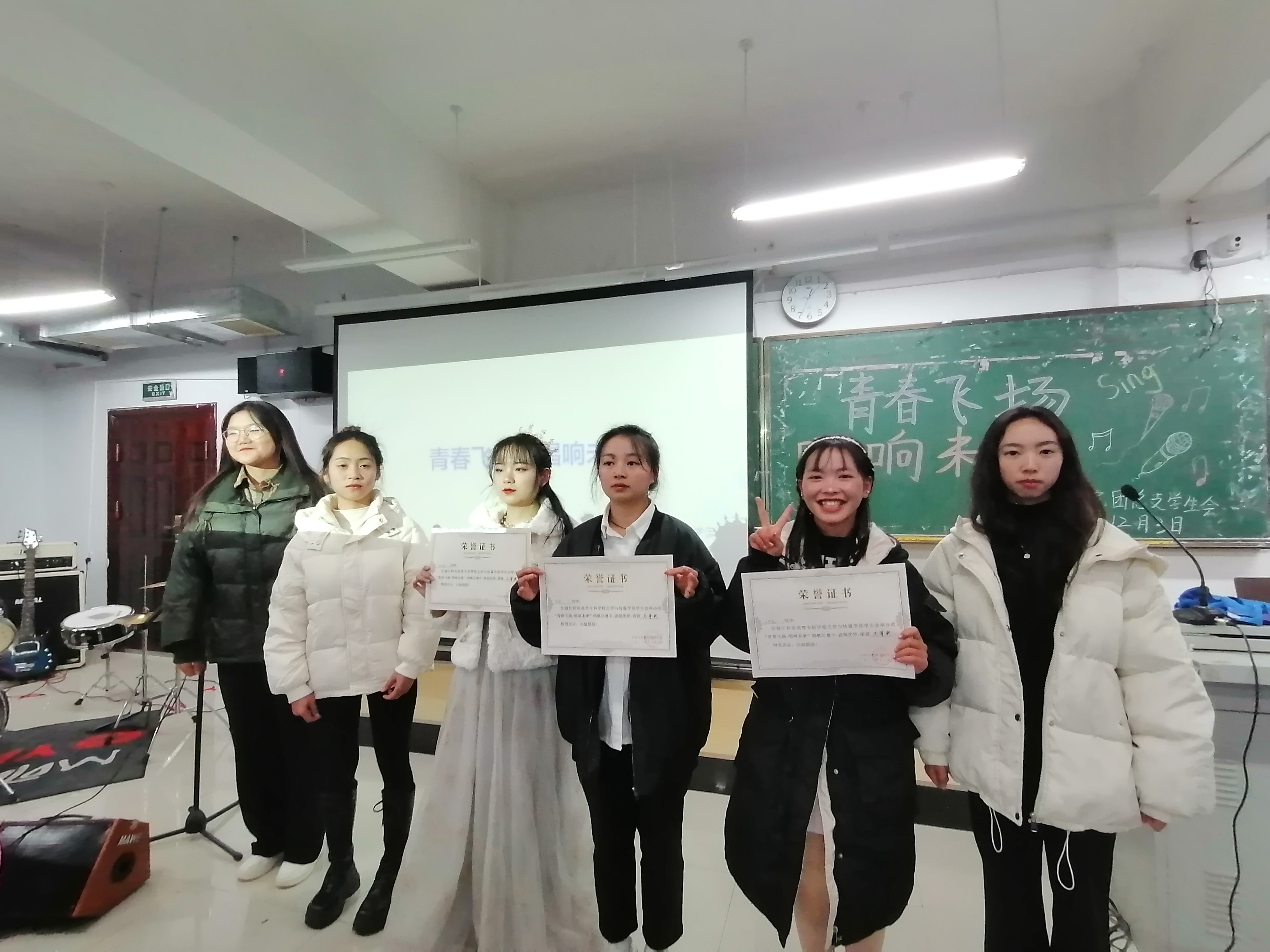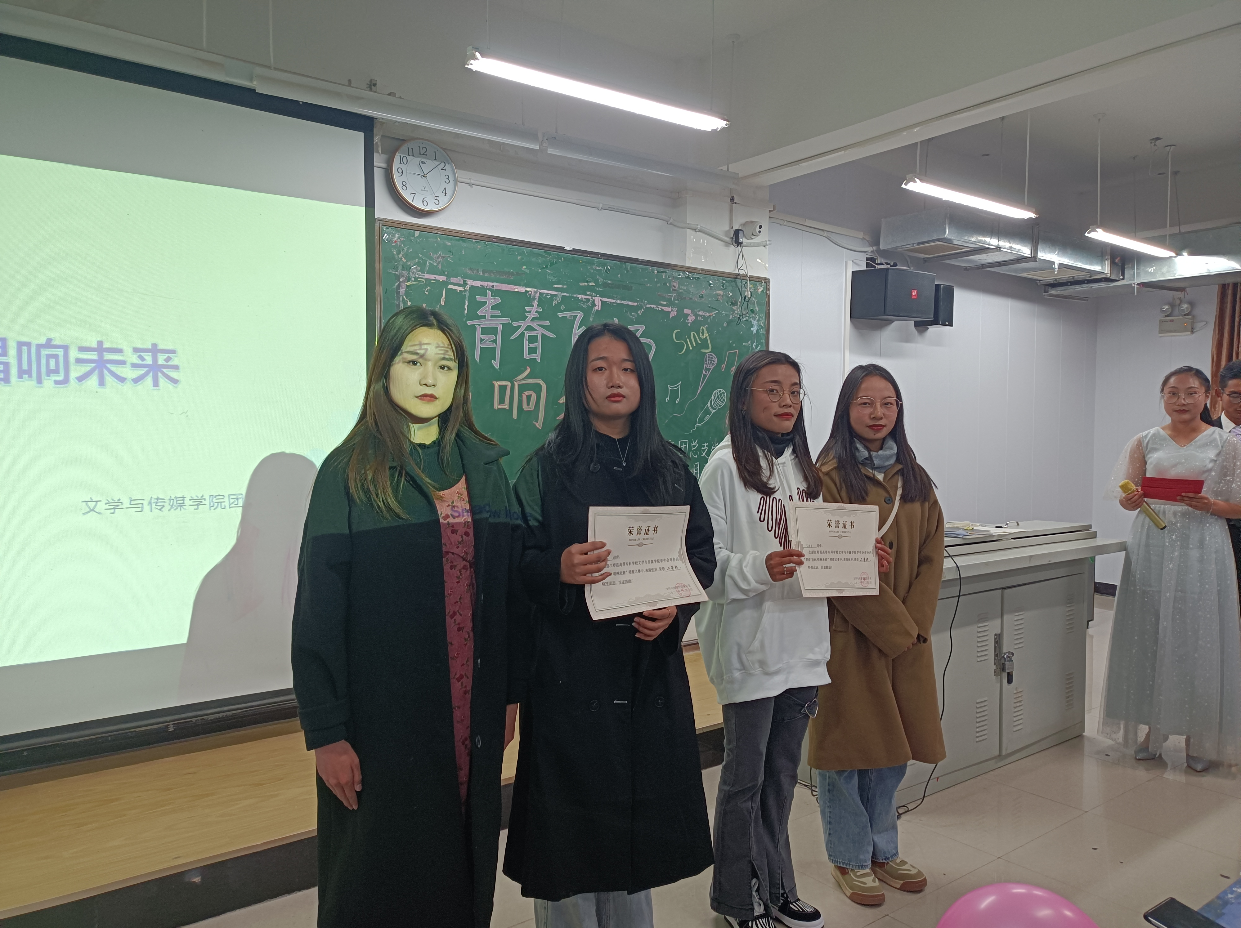 歌声是情感的表达和心灵的寄托,青春是舞动的旋律、是跳跃的音符。美妙的音乐、悠扬的旋律、嘹亮的歌声也是点燃当代大学生满腔热情的一种方式。为此,文学与传媒学院团总支学生会于12月3日19:00在教学楼229举办“青春飞扬,唱响未来”系列活动。董壁瑞获得本次比赛一等奖,宋相玲、李坤泽获得二等奖,三等奖由王杏鑫、晏冉和朱双菊获得。